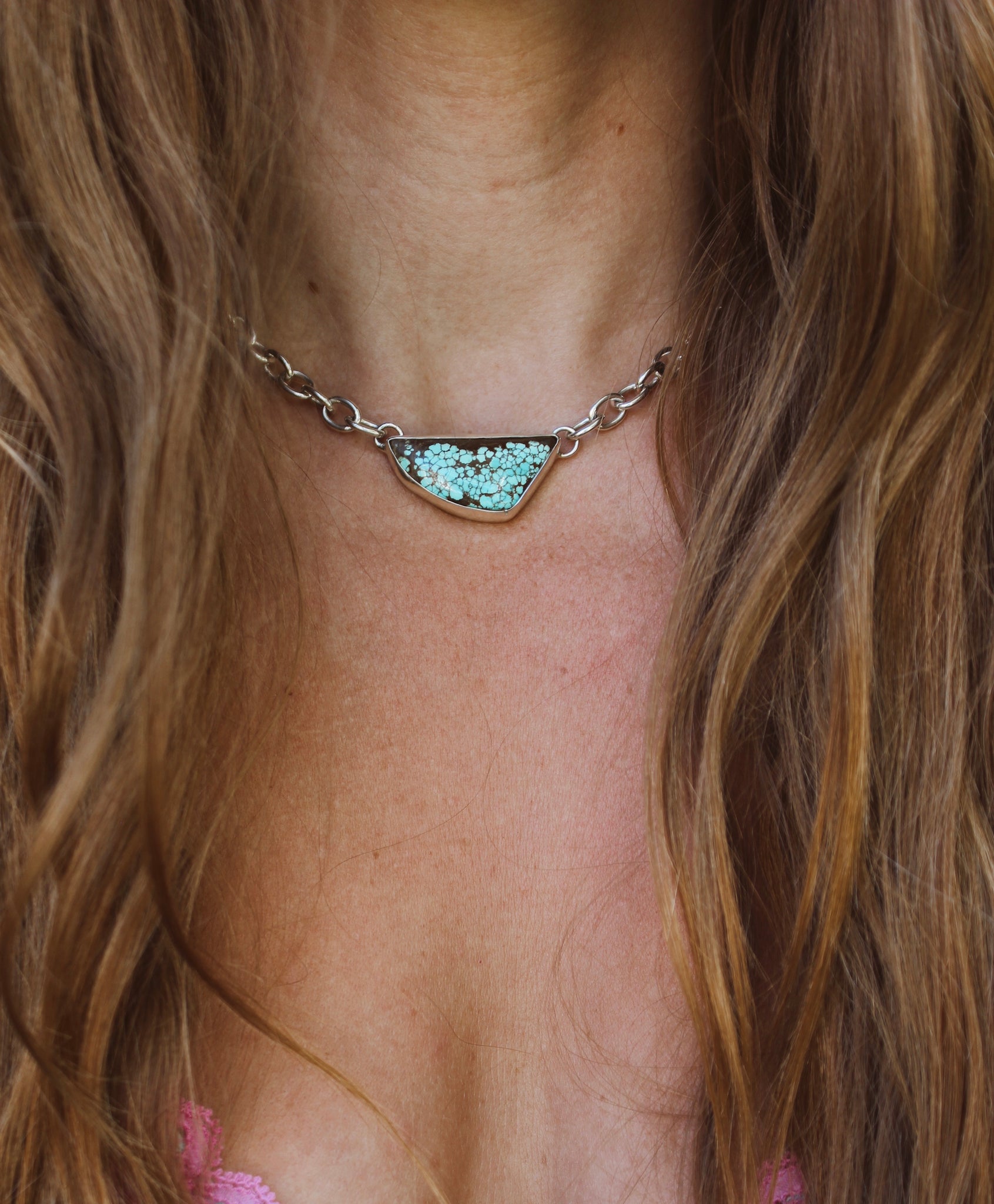 This handcrafted sterling silver choker, features a stunning centerpiece of turquoise. Meticulously crafted to showcase the natural beauty of the stone, this piece is hand-stamped with .925 and finished with a hand-carved brass snake on the back. The adjustable design ensures a comfortable fit, making it an ideal choice for both everyday wear and special occasions.